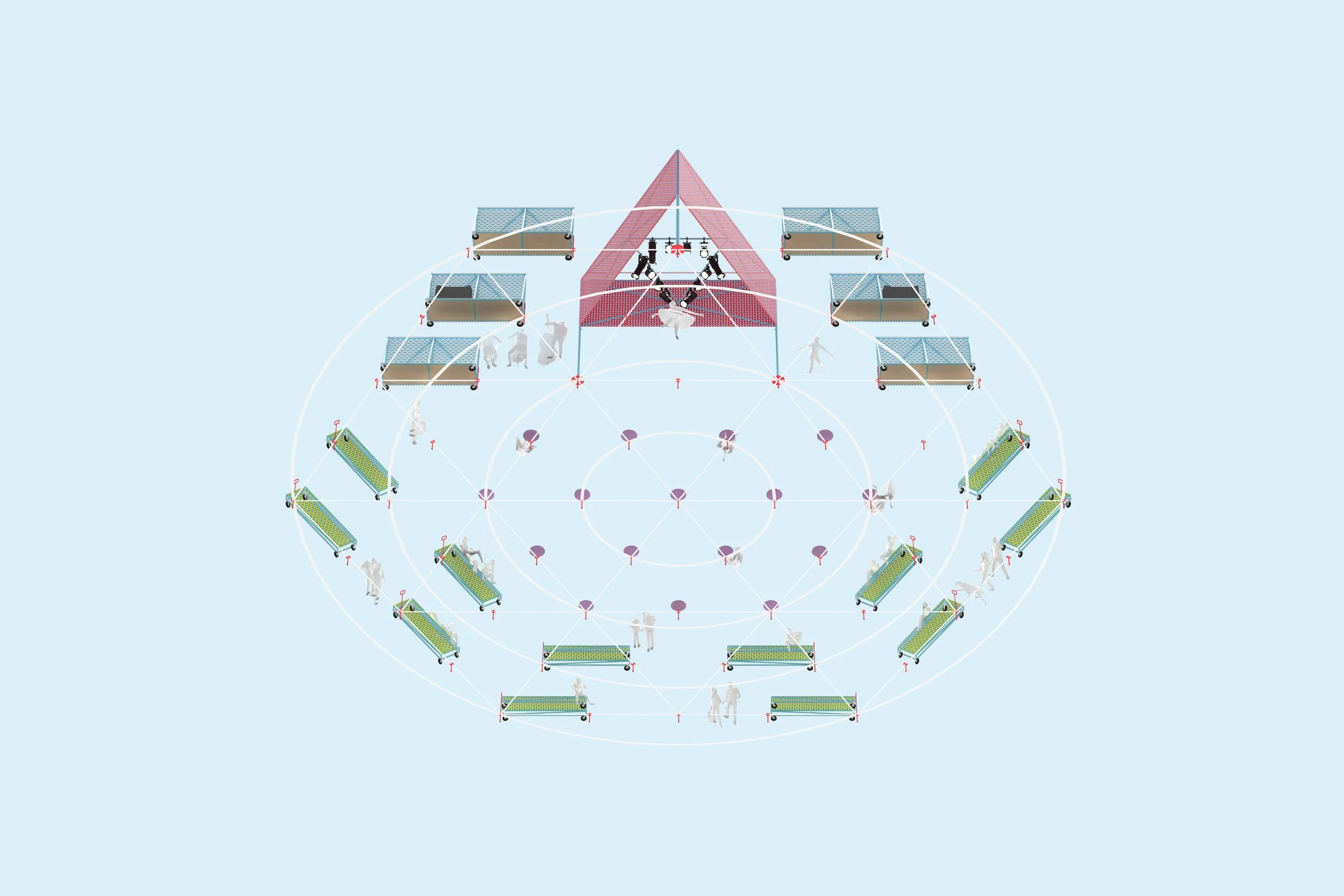 A series of lightweight, dynamic structures for the performing arts pivot along a geometric field, marking rural territories and inviting artists and audiences to tune their environment. This project emerges from an inquiry into the hidden geometries of rural land and their entanglement with history, infrastructure, and perception.